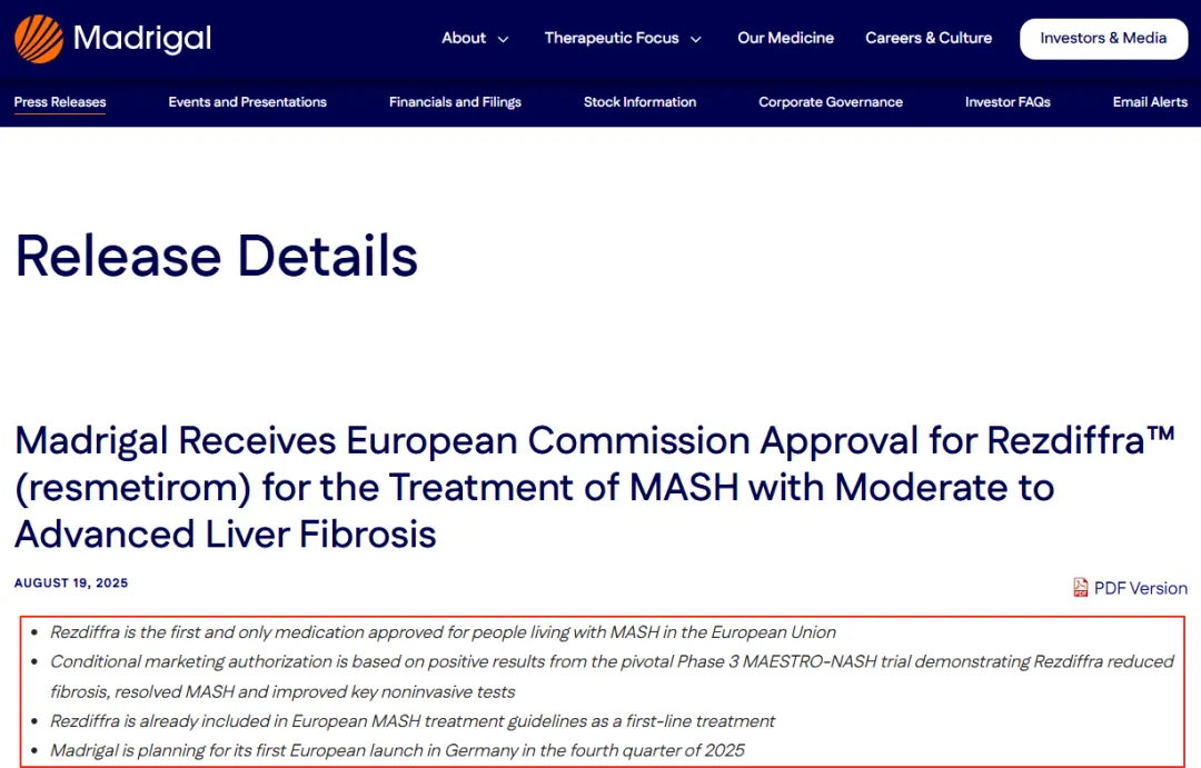 2025年8月19日,歐盟委員會(huì)正式批準(zhǔn)Rezdiffra?(Resmetirom)上市,用于治療伴有中度至進(jìn)展期纖維化的代謝相關(guān)脂肪性肝炎(MASH)患者。Rezdiffra?成為歐盟該疾病領(lǐng)域首個(gè)且目前唯一獲批的藥物,并且已被納入歐洲MASH治療指南。
