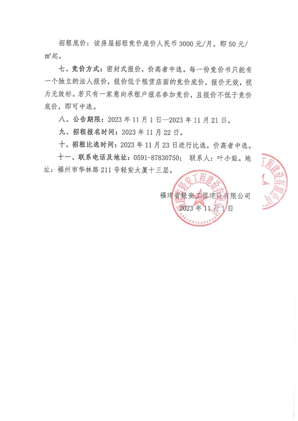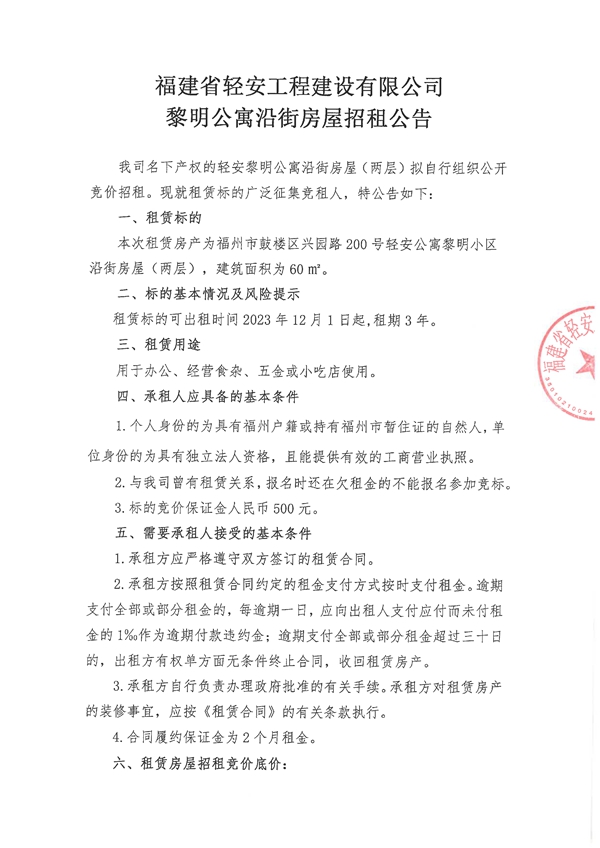 福建省輕安工程建設(shè)有限公司黎明公寓沿街房屋招租公告