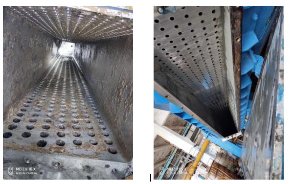 流漿箱進(jìn)漿方錐總管和緩沖室、飄片室內(nèi)部漿流面以及唇口區(qū)(下唇板漿流面、側(cè)墻板、上唇板梁漿流面)結(jié)垢嚴(yán)重,內(nèi)部的清潔度和表面的光潔度對(duì)于造紙生產(chǎn)非常重要。結(jié)垢如下圖所示: