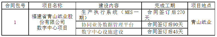 福建省青山紙業(yè)股份有限公司數(shù)字中心項目進(jìn)行公開招標(biāo)?,F(xiàn)歡迎合格投標(biāo)人對該招標(biāo)項目進(jìn)行密封投標(biāo)。