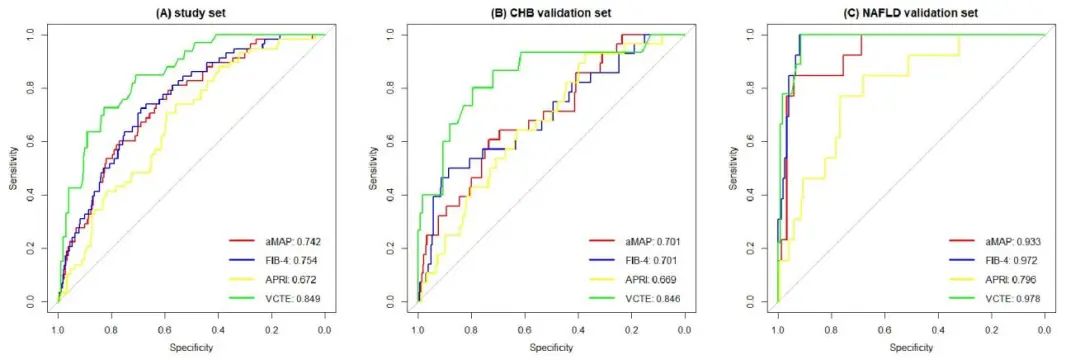 結(jié)果表明,CHB和NAFLD患者中肝硬化占比分別為10.0%和8.1%。在研究組,aMAP評分診斷肝硬化的AUC為0.742,與FIB-4(0.754)和APRI(0.672)相當(dāng)(P>0.05)。在CHB驗(yàn)證組獲得了類似結(jié)果,而在NAFLD驗(yàn)證組中,aMAP評分診斷肝硬化的AUC高達(dá)0.933,與FIB-4相當(dāng)(0.972,P>0.05)并且顯著高于APRI(0.796,P<0.05)(圖1)。<>
